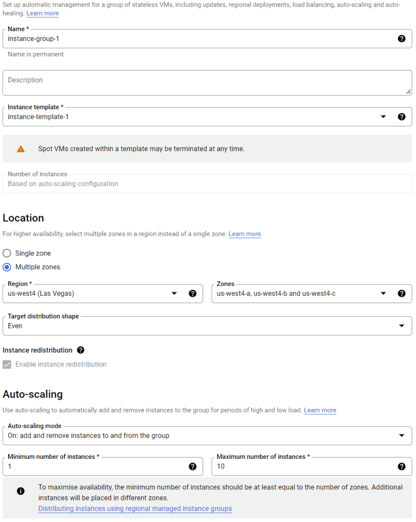 Managed Instance Groups (MIGs) can help to make your workloads more flexible and resilient, especially if you require multiple Spot VMs. A MIG is created from an instance template with minimum and maximum instance numbers.