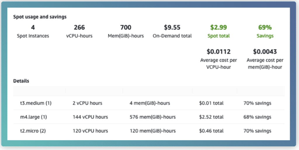 Usage and savings information for fleet-level Spot instances or all ongoing Spot instances can be viewed for cost-saving purposes. At fleet level, the usage and savings information includes all instances started and terminated by the fleet. You can view this information from as recently as the last hour or up to three days.