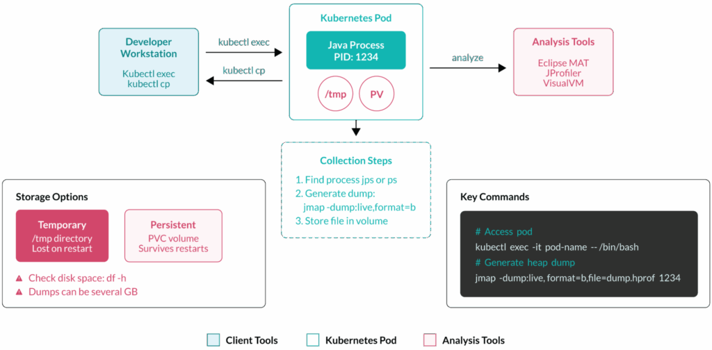 | Storage and transfer strategies | Use persistent volumes for dump storage and kubectl cp for file transfer. These storage strategies help heap dumps survive pod restarts and be accessible for offline analysis. |
