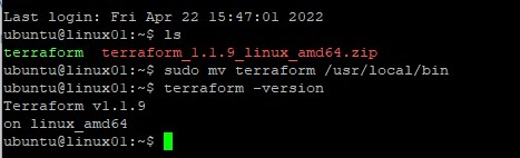 Next, run the command below to move the terraform package into a folder in your default path – you will be prompted for your password.