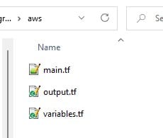 Pro-tip: you could combine these into one file, but it’s better to keep them separated so your codebase has structure as it grows. The naming convention used is your choice, but the names we use here are the ones in common use and can be understood by other Terraform engineers.
