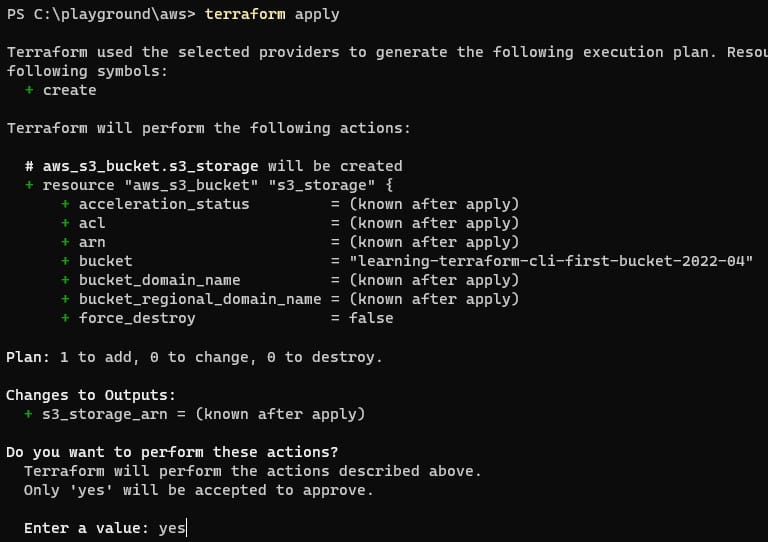 Terraform will now re-run the plan and prompt you to perform the actions outlined – when you are happy, type yes and press return.