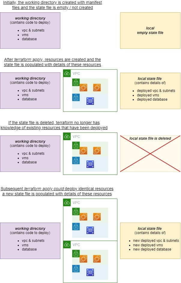 - The tfstate file is crucial since it tracks the state of the infrastructure based on changes Terraform has made. This is created and updated each time an apply or destroy command is run