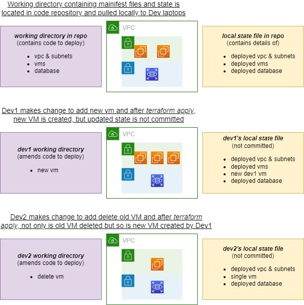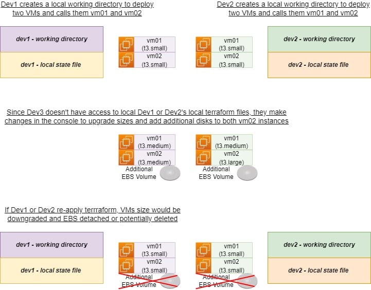 Furthermore, several environments might exist (dev, test, production etc) managed by different teams. If each developer were to store state files locally, it would quickly lead to differences between files. This creates serious problems when an apply process is completed – a developer’s work could be deleted because Terraform thinks it’s no longer required, based on the applied state file!