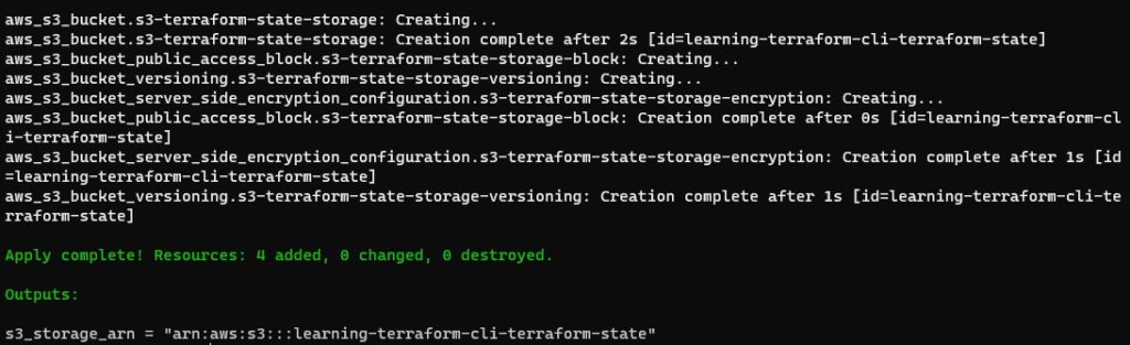 terraform { backend "s3" { encrypt = true bucket = "learning-terraform-cli-terraform-state" dynamodb_table = "learning-terraform-cli-terraform-state" key = "terraform/terraform.tfstate" region = "eu-west-1" } }