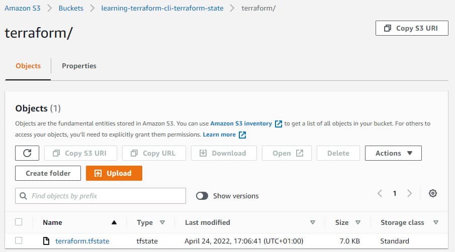 Looking within that S3 bucket, we can see the structure of our state as per the key field entered under the terraform block above.