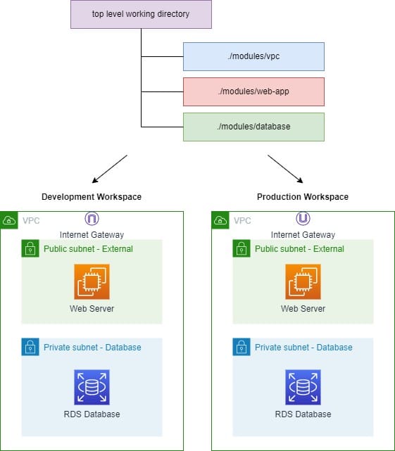 Workspaces introduce the concept of separating the state of different environments or use-cases into different files. This allows identical environments to be built in an isolated fashion and prevents interference from one to the other. For example, the code modules we used to build the VPC, web server and database could be deployed into a workspace called “development”. Then, if need be, built again into a workspace called “production”. This could use the same code, but customized by different variables.