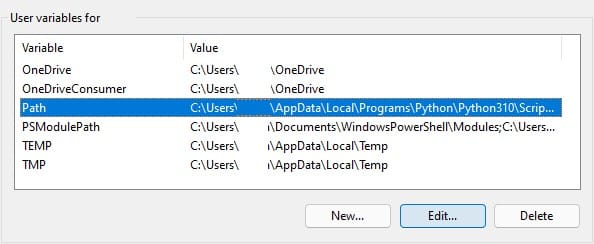 For Windows, you can see and edit your user’s path variables by typing “path” into the search bar as shown below.