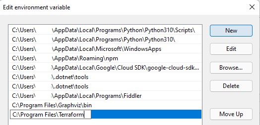 From here, you can either copy the executable into an existing folder, or create a new folder (e.g. C:\Program Files\Terraform) and then add this into your Path variable.