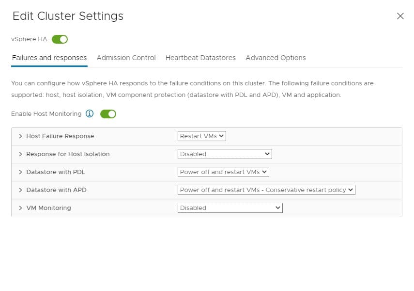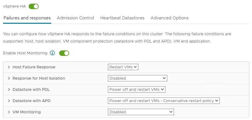 VMware’s High Availability includes multiple configurable features. The right choice of configuration options varies depending on your specific use case (host failure, admission control, etc.). However, the default settings are a great starting point for many vSphere deployments.