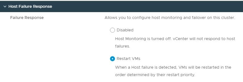 Host failure response is the most well-known HA feature. When a host fails, what do you want vSphere to do? Usually, you want virtual machines on that failed host to be powered back on to other functioning hosts within the same cluster. The “Restart VMs” option does that for you.