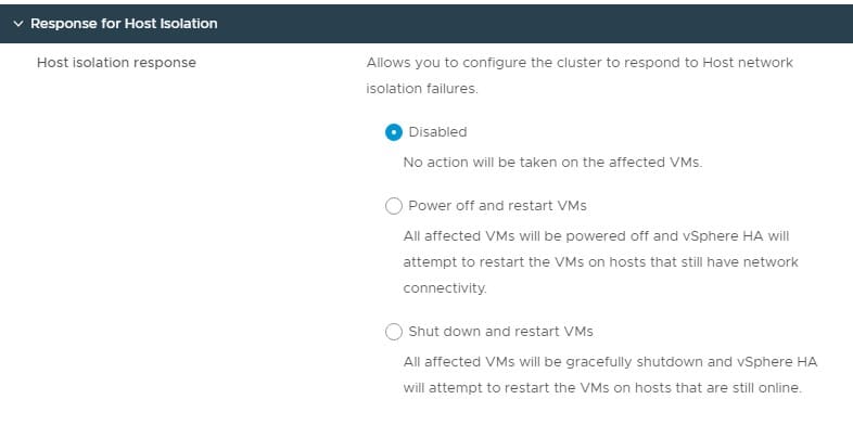 Sometimes a host can become isolated from others in the cluster. When this happens, VMware calls this a host isolation event. If a host becomes isolated, it could be a simple issue with the management network. In that case, virtual machines continue to operate, but vSphere doesn’t know the state of the virtual machines. We must decide if we want virtual machines to be gracefully powered off and back onto other hosts in the cluster or forcefully powered off and back on again.