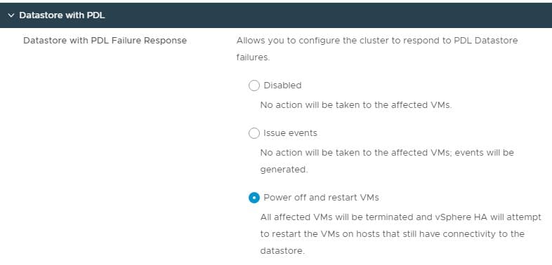 Datastore with PDL (Permanent Device Loss) Response | Disabled, Issue Events, Power off & restart VMs |