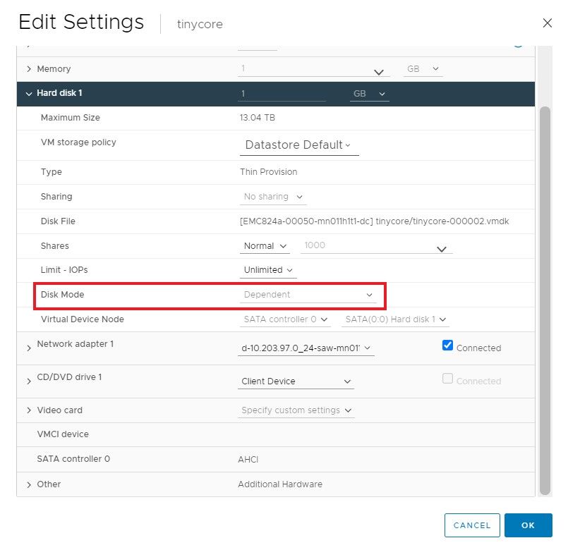 - Right-click the VM > Edit Settings > Virtual Hardware > Expand the Hard Disk > Select Independent-Persistent or Independent-Nonpersistent > Click on OK