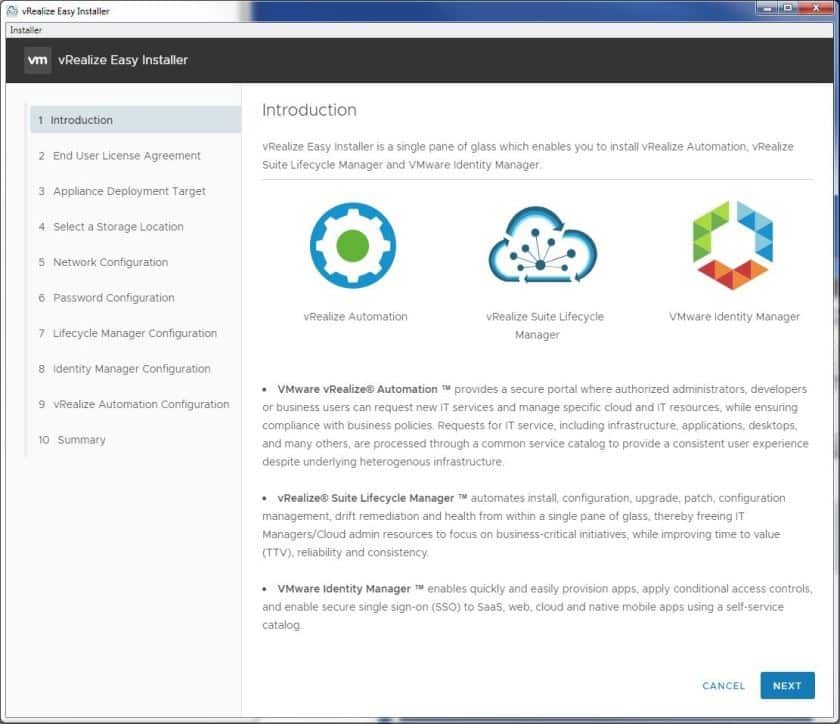The vRealize Easy Installer streamlines vRA installation and makes deployment far less error-prone than previous versions of vRealize Automation. The basic vRealize Automation installation steps are: