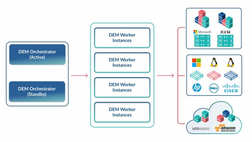 Typically, two Orchestrator machines were deployed onto Windows servers for High Availability, with one being active and the other passive. Multiple DEM Workers were deployed, with each one interacting with a specific target, such as AWS, Openstack, RHEV, or SCVMM.