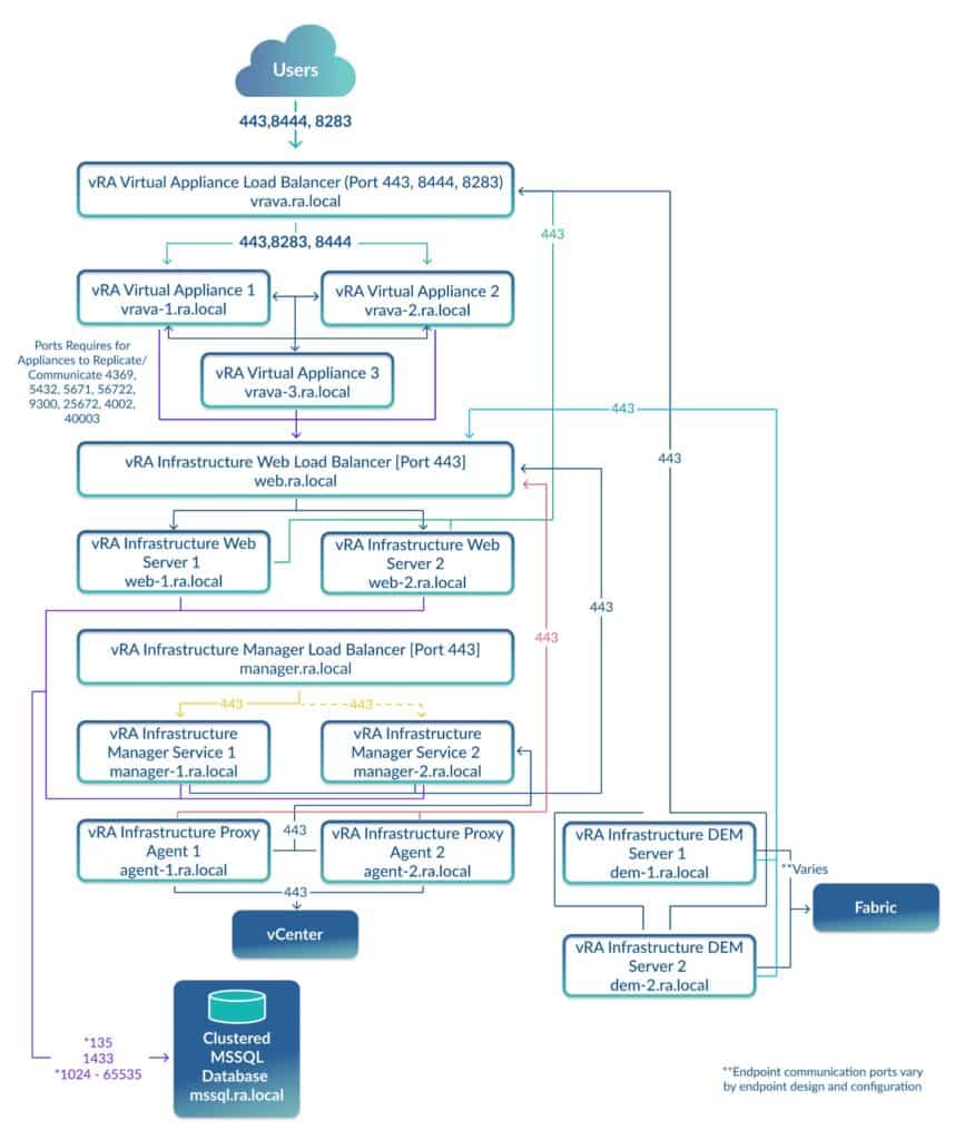 With Clustered Deployment Architecture vRA runs across three clustered appliances behind a supported load balancer (such as NSX-T). VMware Identity Manager is also clustered across three appliances and accessed via a Load Balancer. The load balancer is configured to regularly test the health of the appliances and redirect traffic to surviving members should one fail. The vRealize Lifecycle Manager is placed into an HA-enabled vSphere cluster but is deployed as a single node and does not yet support being clustered.