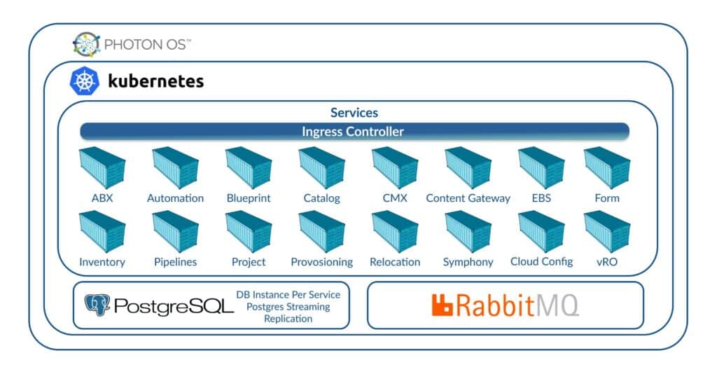 To provide high availability while maintaining simplicity, VMware containerized the various vRealize Automation services. Docker is used to physically run the services as containers via Helm, while a special self-deployed and self-managed distribution of Kubernetes orchestrates and provides service availability and accessibility.